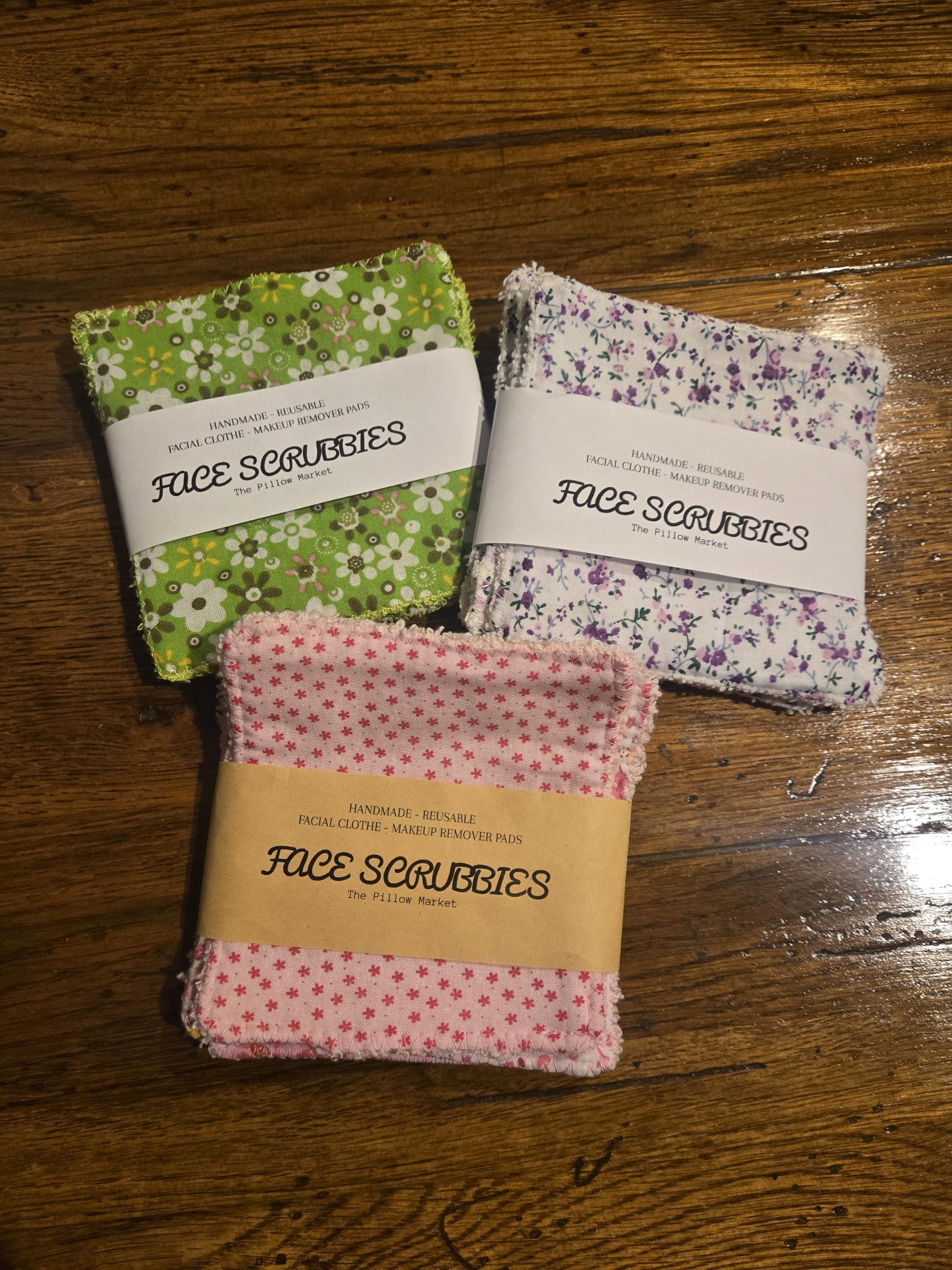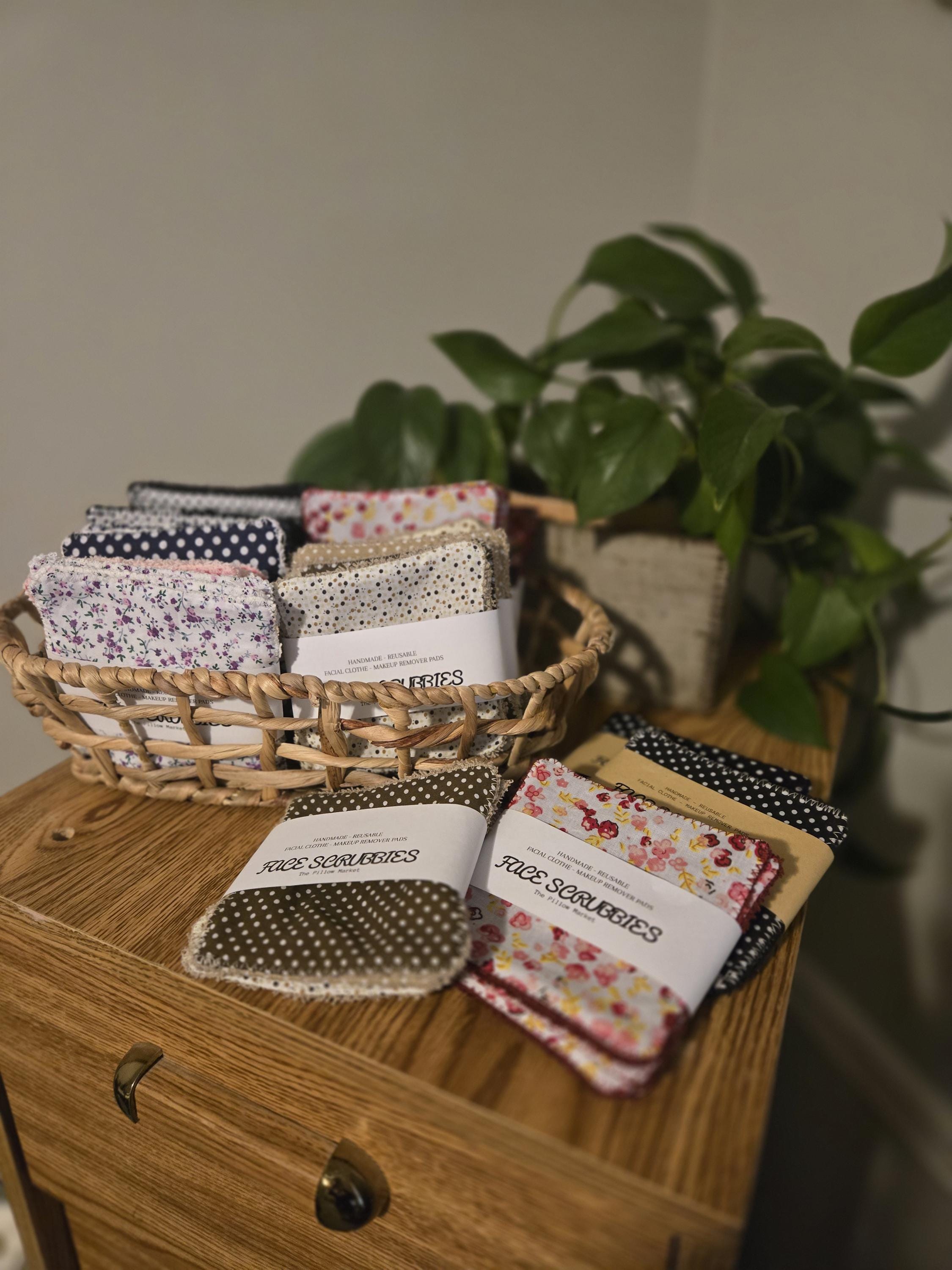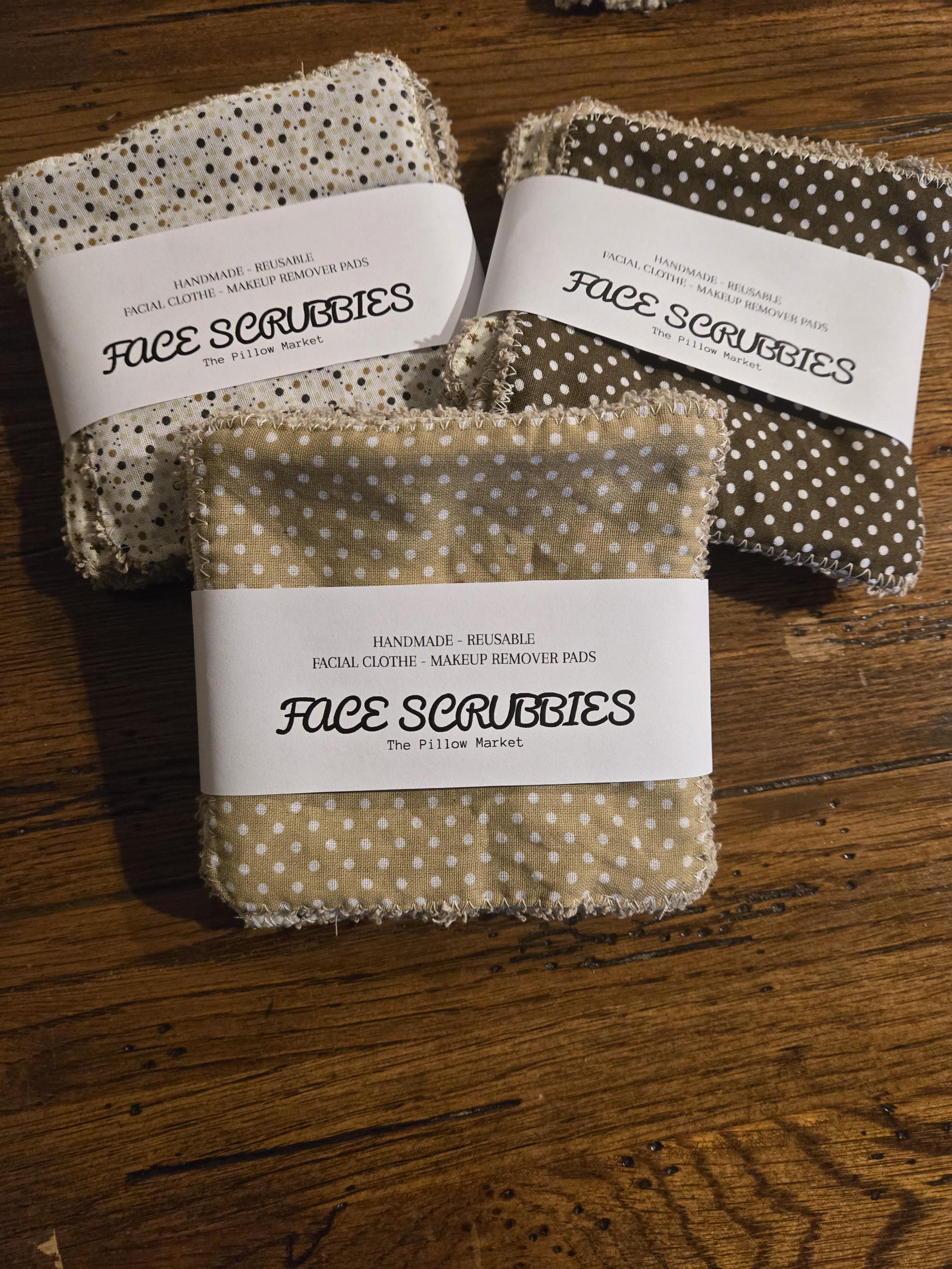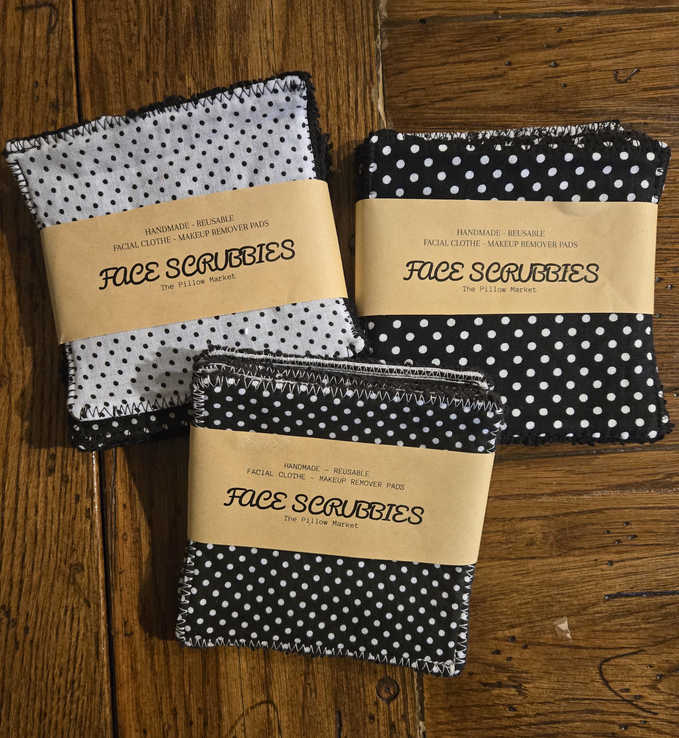 Each reusable facial scrubbie is handmade from 100% cotton on one side and absorbent terry cloth on the other, gentle enough for sensitive skin, yet effective for removing makeup or applying toner.