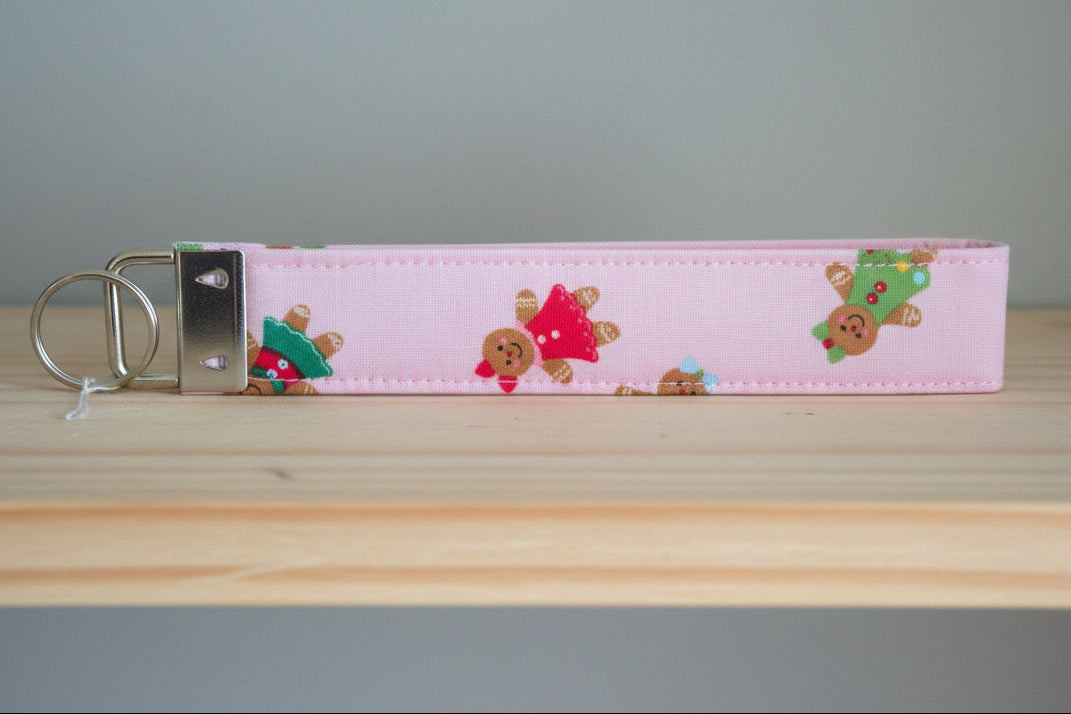 Carry your keys in festive style with this adorable gingerbread people keychain wristlet. Crafted from soft pink fabric, it features charming gingerbread boys and girls that bring a playful, seasonal touch to your everyday essentials. The secure wrist strap keeps your keys safely within reach, while the lightweight design makes it perfect for on-the-go adventures. A sweet accessory that combines function with fun.