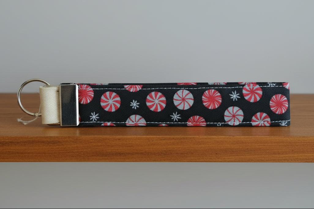 Jingle all the way to organized with our Peppermint Patty keychain wristlet! This cozy black fabric design features festive peppermint accents that bring holiday cheer to your everyday carry. Slip your hand into the secure wristlet loop and keep your keys safe while you're on the go. Soft to the touch and perfectly sized for your pocket or bag, it's the sweet gift idea for anyone who loves keeping their essentials close. Spread the peppermint joy this season!