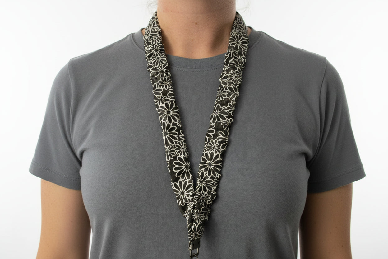 Secure your essentials in style with this black fabric scrunchie lanyard adorned with delicate white flowers. Perfect for keeping your ID and keys within arm's reach, it combines practical functionality with a charming, feminine design. Slip it around your neck and enjoy hands-free convenience wherever you go—whether you're at the gym, running errands, or out for the day. A playful accessory that keeps what matters close.